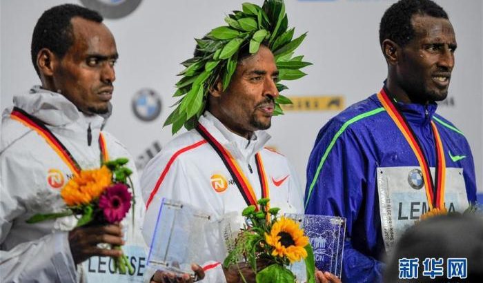 資料圖:在2019柏林馬拉松賽中,埃塞俄比亞选手凱內尼薩-貝克勒(中)以2小時1分鐘41秒的成績奪得男子組冠軍。圖片來源:新華網 新華社記者連振攝