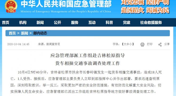 中新網10月4日電 據應急管理部網站消息,10月4日5時40分許,吉林省松原市扶余市長春嶺鎮發生一起貨車相撞交通事故,造成18人死亡,1人受傷。