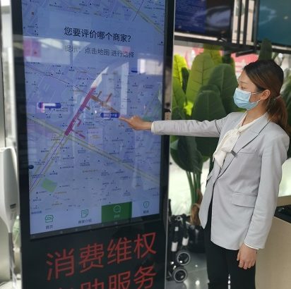 在成都市春熙路的消費維權自助服務終端機上,消費者可以自助選擇商家進行消費評價。