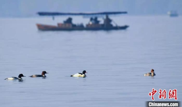 除了鸕鶿,西湖邊還有鴛鴦、織女銀鷗和普通秋沙鴨三種冬候鳥。