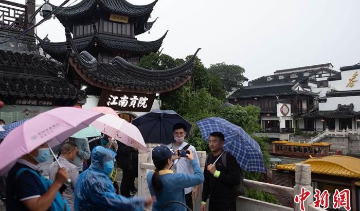 10月4日,市民和遊客冒雨在南京夫子廟景區內品美食、游秦淮河、參觀夫子廟,感受明清科舉文化。