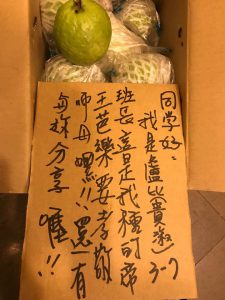 那天突然收到一大箱芭樂,一頭霧水地打開,馬上就樂了。是老王的學生盧比寄的,心意寫在箱子的厚紙板上,字好大,讓人心好暖。