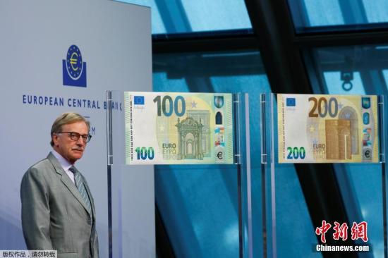 資料圖為歐洲央行總部工作人員展示100歐元和200歐元鈔票。