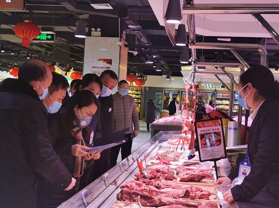襄陽市市場監管局局長郭方芳(左三)帶隊檢查超市肉製品索證索票情況。