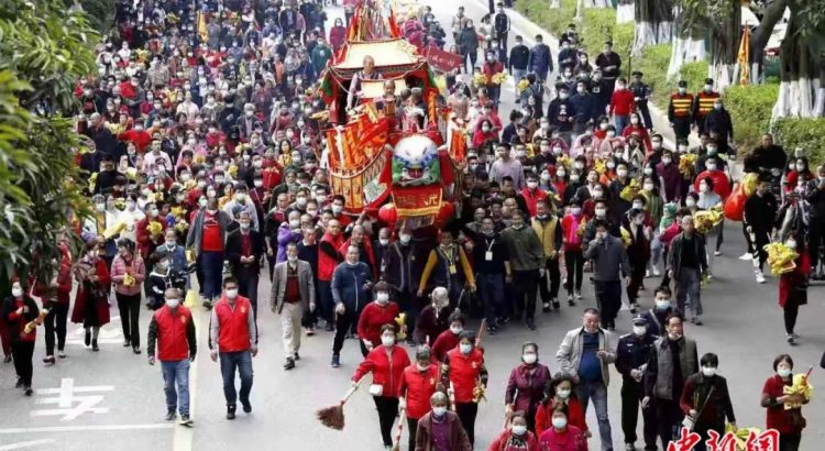 民眾以各種藝陣開道,簇擁着王爺巡安。中新社記者 呂明 攝