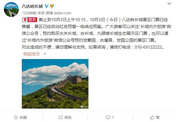 中新網10月3日電 據八達嶺長城風景名勝區官方微博消息,截止到10月3日上午10:15,10月3日(今日)八達嶺長城景區門票已經售罄,景區已經啟動紅色預警一級響應預案。廣大遊客可以關注“長城內外旅遊”微信公眾號,預約購買水關長城、古長城、九眼樓長城生態展示區門票,也可以通過“長城內外旅遊”微信公眾號預約世葡園、古崖居、世園公園的景區門票。