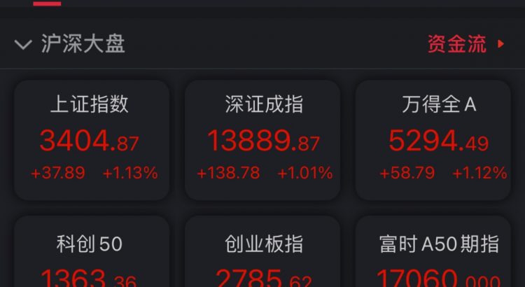 截至收盤,滬指報3404.87點,漲幅1.13%,成交額3647.4億元;深成指報13889.87點,漲幅1.01%,成交額4270.11億元;創業板指報2785.62點,漲幅0.9%;上證50指數報3539.54點,漲幅1.55%。