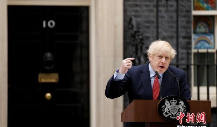 英首相約翰遜在3月27日進行新冠病毒檢測,結果呈陽性。於4月6日晚因病情惡化轉入重症監護室治療。當地時間4月12日,英國首相約翰遜出院休養。圖為英國首相鮑里斯約翰遜在倫敦唐寧街10號發表演講。