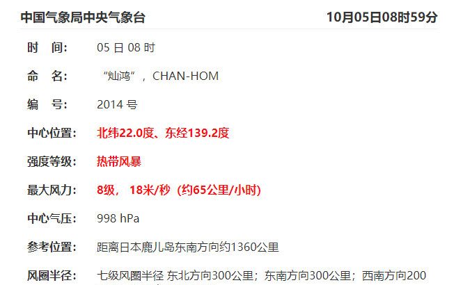 中新網10月5日電 據中央氣象台官方微博消息,今年第14號颱風燦鴻生成,熱帶風暴級(8級,18米/秒)。其中心位於日本鹿兒島東南方向約1360公里的洋麵上,預計強度逐漸加強。