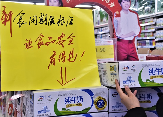 中國消費者報西安訊(記者 徐文智)“請在2020年2月13日前食用。”2019年12月30日,在陝西省西安市未央路人人樂賽高店選購牛奶的市民袁先生,欣喜地發現常喝的一款乳製品的外包裝箱,增加了這樣的一句標識。他高興地告訴記者,“產品的外包裝上醒目標註了食用期限,我們再也不用費神計算什麼時候到保質期,對我們消費者來說,這個標註提醒太好了。”