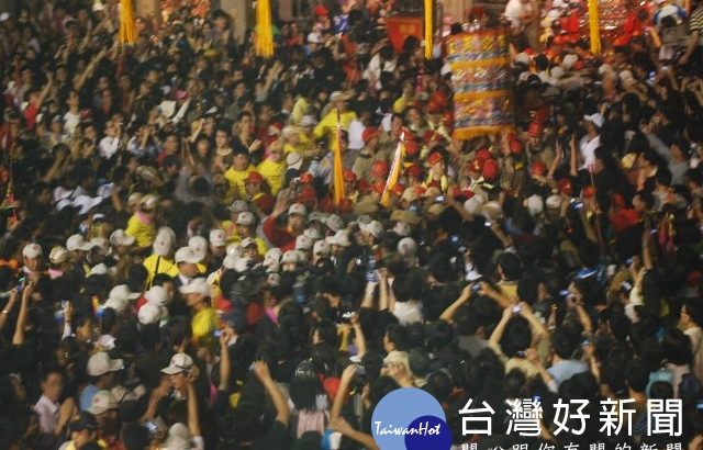 大甲媽祖深夜遶境進香起駕時刻,送駕人潮洶湧、陣頭長達數公里,熱鬧到沸點,因信眾爭相觸摸神輿而相互推擠,成了熱鬧中之亂象。(記者陳榮昌攝)