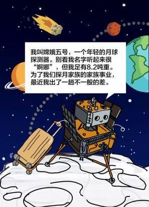 我叫嫦娥五號探測器,一個年輕的胖子。別看我名字聽起來很“婀娜”,但我足有8.2噸重,論噸位可是我們國家今年“上天”的小夥伴中的翹楚。