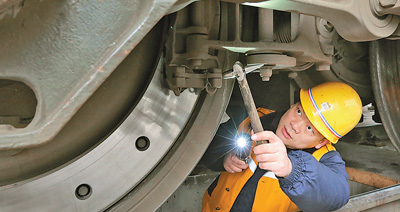 春運以來,地處京廣、隴海兩大幹線交匯處的中國鐵路鄭州局集團有限公司鄭州機務段,新增58列春運臨客牽引任務。為保證臨客機車質量安全,該段加強庫內作業整備力度,對機車大頂、制動機、走行部、電器元件等關鍵部件進行拉網式排查,發現隱患及時處理,確保機車出庫質量。圖為鄭州機務段地勤專檢班長劉龑瓏正在對臨客出庫機車走行部進行重點檢查。