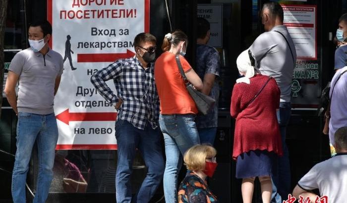 圖為哈薩克斯坦民眾在藥店外排隊。