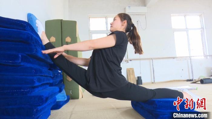 鄭倩倩正在進行一字馬訓練來增加自己的柔韌性。 劉鴻鶴 攝