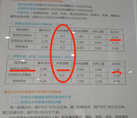 讓人不解的是,這份《水價公示》中,儘管在水價構成明細及構成項目上城鄉各異,且後者(鄉鎮)飲用水水價構成中显示無水資源費,但到戶價格卻一致,即城鄉水價都是3.10元/立方米。